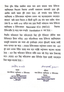 এই সংবাদ বিয়পি পৰাৰ পাছত অসম মেডিকেল কলেজ কতৃপক্ষৰ হৈ অধ্যক্ষ ডাঃ সঞ্জীৱ কাকতি আৰু অধীক্ষক ডাঃ ধ্ৰুবজ্যোতি ভূঞাই স্পষ্টীকৰণ দাঙি ধৰি কয় যে বিগত দুদিন বিভিন্ন সামাজিক মাধ্যম আৰু প্ৰচাৰ মাধ্যমত অসম চিকিৎসা মহাবিদ্যালয়ৰ শিশুৰোগ বিভাগত এগৰাকী নৱজাতকৰ সালসলনি হোৱা বুলি প্ৰচাৰিত বাতৰি আমাৰ দৃষ্টি গোচৰ হৈছে। এই সন্দর্ভত অসম চিকিৎসা মহাবিদ্যালয় ও চিকিৎসালয়ৰ কৰ্তৃপক্ষৰ তৰফৰ পৰা সকলোৰে জ্ঞাতার্থে জনাব বিচাৰো যে জুনটি মেছ গগৈ আৰু নৱজিৎ গগৈৰ যোৱা ইং ৩০ আগষ্ট ২০২৫ তাৰিখে জন্ম হোৱা শিশুটি বর্তমানেও অসম চিকিৎসা মহাবিদ্যালয় ও চিকিৎসালয়ৰ Neonatal ICU (NICU) বিভাগত চিকিৎসাধীন হৈ আছে আৰু সম্প্রতি Ventilation ত ৰখা হৈছে।শিশুটিৰ অভিভাৱকে উক্ত অভিযোগটো মিছা বুলি ইতিমধ্যে মৌখিক আৰু লিখিতভাবে স্বীকাৰ কৰিছে। এনে পৰিপেক্ষিতত অসম চিকিৎসা মহাবিদ্যালয়ৰ ভাৱমূৰ্ত্তি জনমানসত ম্লান কৰাৰ এটা কু-অভিপ্রায় কোনো দুষ্টচক্রই অহৰহ চলাই থকাৰ সন্দেহৰ স্থল আছে।সেয়েহে চিকিৎসালয়ৰ কৰ্তৃপক্ষৰ তৰফৰ পৰা এনে দুষ্ট চক্ৰৰ ওপৰত বিহিত ব্যৱস্থা লবৰ বাবে সংশ্লিষ্ট কর্তৃপক্ষক আবেদন জনোৱা হৈছে। এনে মিছা অভিযোগে চিকিৎসা কর্মীৰ মনত কষ্ট দিয়ে আৰু নিৰুৎসাহ কৰে। সেয়েহে এনে মিছা অভিযোগক প্রশ্রয় নিদিবলৈ ইয়াৰ দ্বাৰাই সকলোকে বিনম্র আহ্বান জনোৱা হৈছে।