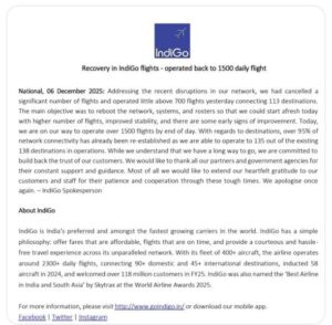 ইণ্ডিগ’ই নিয়ন্ত্ৰকক জনাই যে সংশোধনীমূলক ব্যৱস্থা চলি আছে আৰু ২০২৬ চনৰ ১০ ফেব্ৰুৱাৰীৰ ভিতৰত সুস্থিৰ বিমান পৰিচালনা সম্পূৰ্ণৰূপে পুনৰুদ্ধাৰ কৰা হ’ব । অৱশ্যে অহা কেইদিনমানৰ ভিতৰত আৰু অধিক বাতিল হোৱাৰ সম্ভাৱনা আছে ।