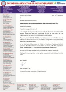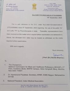 যোৱা ১১ ছেপ্টেম্বৰত সমগ্ৰ দেশৰ বাতৰি কাকত, নিউজ চেনেল, ৱেব পৰ্টেলত ব্যাপকভাৱে প্ৰচাৰিত এই বাতৰিটোত ভাৰত চৰকাৰৰ স্বাস্থ্য সেৱা সঞ্চালকালয়ে (ডিজিএইচএছ) ২০২৫ চনৰ ৯ ছেপ্টেম্বৰত জাৰি কৰা পত্ৰৰ ভিত্তিত ফিজিঅ’থেৰাপিষ্টসকলে “ডাঃ” উপাধি ব্যৱহাৰ কৰাত নিষেধাজ্ঞা আৰোপ কৰা হৈছে।